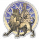 Lion vintage de style héraldique or avec chapeau supérieur de style Steampunk ajouté, garde-temps et élément architectural rond en bleu