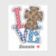 Il s'agit d'un design "LOVE" mignon et coloré, avec une croix d'empreintes animalières représentant le "O". Les autres lettres sont rouges ou bleues avec des pois ou des chèques dans la conception.