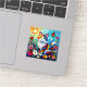 A sweet sticker with a cute illustration of a colorful abstract cat surrounded by flowers, butterflies and the sun in a paper quilling impasto style.