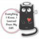 Un chat noir angélique porte un halo et porte un coeur rouge vif sur ce mignon sticker "Cat Knowledge". À côté de lui se trouve une bannière en rouge qui dit "Tout ce que je sais, j'ai appris de mon CAT". Mignonne !