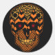 Image crânienne éffrayante en orange et noir avec des yeux rouges brillants, sur un arrière - plan noir. Les autocollants d'Halloween font de grandes astuces ou des cadeaux, et sont amusants pour décorer tous vos projets d'Halloween. <br>Voir tous nos autocollants Halloween dans notre boutique au ()! <a href="http://www.zazzle.com/stickermad/products?dp=0&cg=196880420703973077</a>Copyright Scarribaby Design, une marque déposée, et soutenu par la garantie Zazzle.