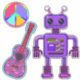 Un mignon robot violet avec signe de paix et une guitare colorée à motifs cardiaques, quel plaisir! par Cherie's Art