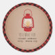 Un autocollant illustrant l'illustration d'une lanterne de camping rouge au-dessus d'un arrière - plan inspiré par un stock de carte avec une bordure rouge et noire. Recherchez les invitations correspondantes chez Jill's Paperie.