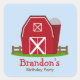 Un autocollant de fête d'anniversaire avec l'illustration d'une grange rouge avec silo et clôture brune. Personnalisez le texte rouge et marron.