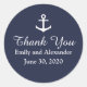 L'autocollant est bleu nuit. Une ancre de bateau blanc est au-dessus du texte blanc. Le texte dit "Merci". Ci-dessous, merci est un endroit pour ajouter vos noms et votre date de mariage.