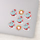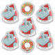 Ensemble de sept autocollants en vinyle coupé avec l'illustration d'un hippopotame souriant heureux avec un casquette du Père Noël, sur un arrière - plan rouge; cinq autocollants de l'hippopotame et deux autocollants avec une couronne de Noël; avec un modèle texte personnalisable pour votre nom ou message