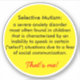 Faites savoir aux gens pourquoi vous ne parlez pas et aidez-les à comprendre ce qu'est le mutisme sélectif. Customiser pour modifier le texte ou la couleur arrière - plan. "Le mutisme sélectif : un trouble d'anxiété grave que l'on retrouve le plus souvent chez les enfants et qui se caractérise par une incapacité à parler dans certaines situations ("select") en raison d'une crainte de communication sociale." Note : bien que le texte soit censé sembler formel, il ne s'agit PAS d'une définition officielle du mutisme sélectif.