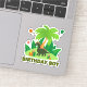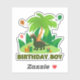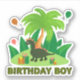 Dinosaure vert mignon avec palmiers, cadeaux, ballons et texte ANNIVERSAIRE GARÇON