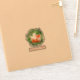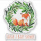 Il y a un renard rouge mignon dans une couronne de verdure aquarelle. En dessous, le nom et les mots "fête prénatale" sont écrits en lettres manuscrites rouges.