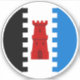 "Par sable pâle et azure, sur un argent bretassy pâle, une tour de gules."