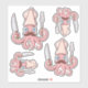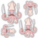 Caricature du chef calmar rose avec moustache tenant couteau et fourche à cuisine.
