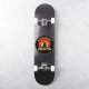 Bigfoot a l'air heureux en marchant. Il s'agit d'un design rétro de lever de soleil en jaune, orange et rouge et est très bien sur un arrière - plan noir ou foncé.