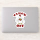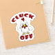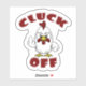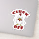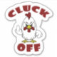 Non seulement ce petit coq de bande dessinée est en colère, mais il tient une aile avec le doigt du milieu - euh, je veux dire, la plume collée au bas du téléspectateur. Le coq est centré dans une formulation rouge profonde, CLUCK OFF.