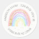 Design arc-en-ciel moderne avec un arc-en-ciel rose, violet et or avec des étoiles dispersées pour un baby shower pour filles.