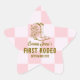 First rodeo with brown floral cowgirl boots, 1st birthday star sticker for party favors or mailings. 1st birthday sticker with simple floral cowboy boots in brown on a vintage pink checkered background and party information. Customize with your information. Create the perfect wild west birthday party aesthetic with matching party supplies, invitations and signs are available in the First Rodeo Pink Cowgirl 1st Birthday Baby Girl Collection in The Gathering Designs store.