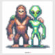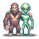 Pixel Art 8-bit bigfoot sasquatch et extraterrestre alien étant amis dans une résolution de vidéo de jeu.
