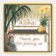 Illustration graphique d'une hutte tiki avec le texte Aloha, merci de vous être joint à nous sur un autocollant de faveur du parti. ©2012charmainepaulson