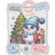 A charming snowman in a cozy blue hat and scarf enjoys a warm drink beside a beautifully decorated Christmas tree. Surrounded by colorful presents and various festive stamps, this delightful scene radiates holiday joy and cheer.