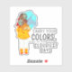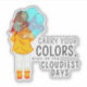 Fille avec parapluie dans le Sticker de Citation Positive Vent. Ce dessin représente une fille debout dans le vent, son dos tourné vers le spectateur. Elle tient un parapluie. Les cheveux de la fille sont soufflés dans le vent. Le texte positif dit "Portez vos couleurs même les jours les plus nuageux".