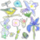 Un ensemble de stickers en vinyle décoré d'une variété de fleurs et de fleurs sauvages dans les tons bleu et rose avec un oiseau de fauvette, papillon, abeille et libellule peint à la main avec de l'aquarelle, de l'encre et un crayon coloré. Un ensemble amusant pour décorer une variété de surfaces!