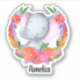 sticker vinyle personnalisé avec éléphant mignon. Cette conception a une aquarelle illustration d'un éléphant de petite fille douce avec des oreilles roses et des orteils roses. Elle regarde à travers une couronne fleurie de fleurs colorées. Le modèle est configuré pour que vous puissiez ajouter votre nom dans une typographie de script soignée.