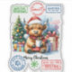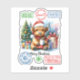 A cute, cartoon highland cow wearing a Santa hat and a red and black plaid scarf sits with a cup of hot cocoa next to a stack of wrapped gifts. A Christmas tree with colorful ornaments sits in the background.