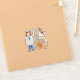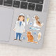This veterinarian themed sticker set designed by Destei features a cute collection of veterinary illustrations. The set includes a cartoon girl veterinarian who is wearing a white lab coat, blue scrubs and a hat with a blue paw print. There is also a brown and white puppy, an orange cat, a syringe with yellow liquid, a blue thermometer, a bandage and three blue paw prints.