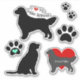 Voici un groupe de stickers pour chien mignons ! Les dessins comportent des silhouettes noires de récupérateurs d'or assis et debout, d'empreintes de pattes, et les expressions "l'amour est doré" et j'aime mon récupérateur d'or."