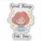 A gentle and inspiring illustration of a girl with closed eyes and a peaceful smile, surrounded by stars and sparkles. The quote “Good things take time” reminds us to be patient and trust the process — beautiful things grow slowly but surely.