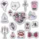 Le pack gothique Stickers Halloween comprend l'oeuvre : Roses de cage de côtes, chauves-souris, ballon de chauve-souris, Cravate de chauve-souris, Détenteur de bougies, Coupe du café, Dagger, Ne pas déranger, Goth Heart Spider Web, Goth Lipstick Clou Polonais, Hourglass, I Suck At Life, Key Bow Cravate.