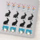 Ce sticker en vinyle a un groupe de différents stickers lapin lapin lapin de Pâques qui comprennent : Bébé blanc mignon dans une cravate arc noir donnant un signe pouce vers le haut, lapin silhouette noire, lapin silhouette noire avec fleurs blanches et texte de Pâques heureux, et lapin blanc assis en fleurs orange et blanches sur un arrière - plan bleu.