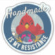 “Handmade Is My Resistance” round badge-style sticker features a bold red cardinal knitting in a blue, retro-modern, mid-century–inspired design.