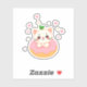 Chat Kawaii assis dans un donut glacé rose avec une petite feuille, souriant avec des joues roses, entouré d'étoiles et de cœurs.