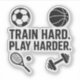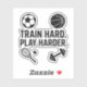 Ajoutez une motivation instantanée avec ce "Train Hard". Jouez plus fort." autocollant sportif. Vous y trouverez des icônes sportives pour le football, le basket-ball, le tennis et la salle de sport. Parfait pour les ordinateurs portables, les bouteilles et les sacs de matériel.
