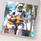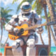 honda asimo nasa robonaut automaton jouant de la guitare connectée à un haut-parleur de tour, armure de cyber-chevalier mécanique et casque d'armure médiévale, exosquelette propulsé conçu par boston dynamics et kuka robotics, circuit imprimé avec câbles, robot castaway, bande de vacances, hi-fi caveman méa donnant un concert lo-fi sur la plage, île délimitée, lagon bleu, eau claire, eau feuillage tropical hawaii, grand plantes de feuilles vertes, cabane dans l'arrière - plan, palmiers, poutres de soleil, éraflures de lentilles, doomerisme, hopecore, indie, rêve de fièvre estivale, photo hdri réaliste, Fuji X-T5, style pixar disney, réalisé par spike jonze