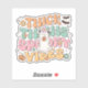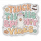 Un design humoristique d'Halloween avec des couleurs pastel de corail, turquoise, rose et jaune avec un fantôme, des fleurs, des chauves-souris, et Jack-o'-lantern avec le texte qui lit Épais cuisses Éffrayant Vibes.