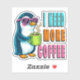 A fun and colorful cartoon penguin wearing sunglasses and holding a hot cup of coffee with the bold phrase “I Need More Coffee.”