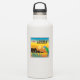 Illustration colorée d'Aruba avec une plage rocheuse, soleil, plantes d'aloès, une perruque à gorge brune et l'étoile à quatre pointes du drapeau d'Aruba. Le nom Aruba est dans une police vintage.
