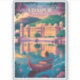 Udaipur design de voyage vectoriel rétro. Udaipur, souvent appelée la Ville des Lacs, est une destination romantique et royale du Rajasthan connue pour ses palais majestueux, ses lacs tranquilles et ses vues pittoresques sur les collines.