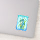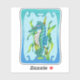 Ce sticker en vinyle a un dragon imaginaire à cheval de mer avec des cornes qui est bleu, vert et blanc avec des cornes et sa queue enroulée autour des algues dans différentes nuances de vert avec des bulles d'eau flottante dans une eau comme un cadre ondulé dans les nuances de bleu.