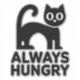 Chat noir stylisé avec de grands yeux et une expression joueuse. Le corps du chat est conçu dans une forme simple et moderne, mettant en valeur sa queue incurvée et sa forme ronde. Sous le chat, la phrase « TOUJOURS AFFAMÉ » est affichée en lettres grasses, également en noir. Le design global est minimaliste, utilisant une palette monochrome qui ajoute à son attrait visuel. La combinaison du chat et du texte crée un thème humoristique et charmant, qui plaira probablement aux amateurs de chats.