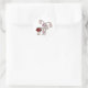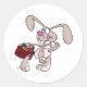 Cette image montre un lapin de dessin animé aux longues oreilles, au nez rose, et de grandes dents portant un panier rempli d'oeufs colorés de Pâques. Le design ludique en fait un autocollant amusant et festif pour les fêtes de Pâques.