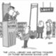 Drôle dessin d'un homme qui retourne un livre de bibliothèque à sa bibliothèque locale, pour découvrir que la pénalité pour retard a augmenté de façon spectaculaire. Un cadeau pour un bibliothécaire peut-être. L'illustration montre la peine capitale par la guillotine. Le juge porte un casquette noir dans la salle d'audience. Humour juridique.