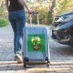 Sticker en vinyle avec l'illustration d'un leprechaun souriant portant un costume vert, une cravate arc-en-ciel, et un casquette bowler assis à l'intérieur d'une casserole d'or et tenant une pinte de bière, avec arc-en-ciel jaune, vert et orange dans l'arrière - plan. L'image est placée sur un arrière - plan vert foncé transparent avec des shamrocks. Un design parfait pour célébrer la Saint Patrick !