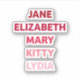 Montrez votre côté bouquin et l'amour pour les livres Jane Austen avec cet autocollant bouquin qui présente les noms des soeurs Bennet dans différentes nuances de rose de Pride et Préjugés par Jane Austen : Jane, Elizabeth, Mary, Kitty et Lydia. Idéal pour les amateurs de livres et les fans de Jane Austen. *Veuillez noter que le filigrane Zazzle qui apparaît dans l'aperçu du zoom n'apparaîtra PAS sur le produit imprimé final. © Bookish and Wonderful
