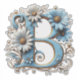 Une grande lettre bleue B présente une garniture dorée, un bord surélevé et des accents floraux complexes avec des marguerites, des vignes et des perles. Parfait pour les projets de branding, d'invitations, de cartes de vœux et de typographie décorative.