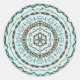 Ce mandala en cercle concentrique comporte des couches de motifs blancs, turquoise et marron inspirés des tissages celtes et du henné indien, tels que des vignes, des rubans et des fleurs de lotus.