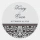 Un motif damassé noir d'inspiration Art Déco est l'arrière - plan de cet autocollant mariage classique. Vos informations customisées se distinguent dans le cadre gris pâle. Suffisamment polyvalent pour un événement lié au mariage : enregistrez la date, les annonces du fiançailles ou utilisez avec votre paquet mariage. Disponible en couleurs alternatives avec produits correspondants. com