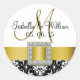 Modèle floral classique noir et blanc Damas avec imprimé Metallic Gold Initial M Stickers de mariage pour votre mariage. Ce design élégant utilise des effets numériques pour IMPRIMER l'apparence d'un ruban satiné jaune et d'une broche en diamant et un effet 3D d'or métallique monogramme initial sur une surface plane. Elke Clarke©2012 Pour des lettres ou initiales différentes, un ruban de couleur différent, une couleur arrière - plan ou un motif damassé, veuillez contacter luxuryweddinginvitations@gmail.com.