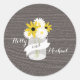 Un autocollant de mariage extérieur du soir avec l'illustration d'un bocal de maçon rempli de marguerites et de vêtements aux yeux noirs entre les noms de la mariée et du marié.